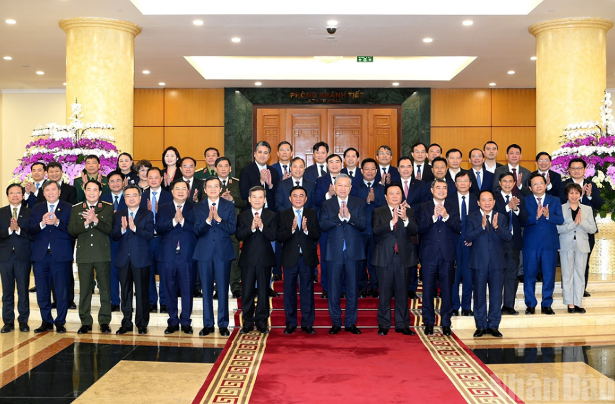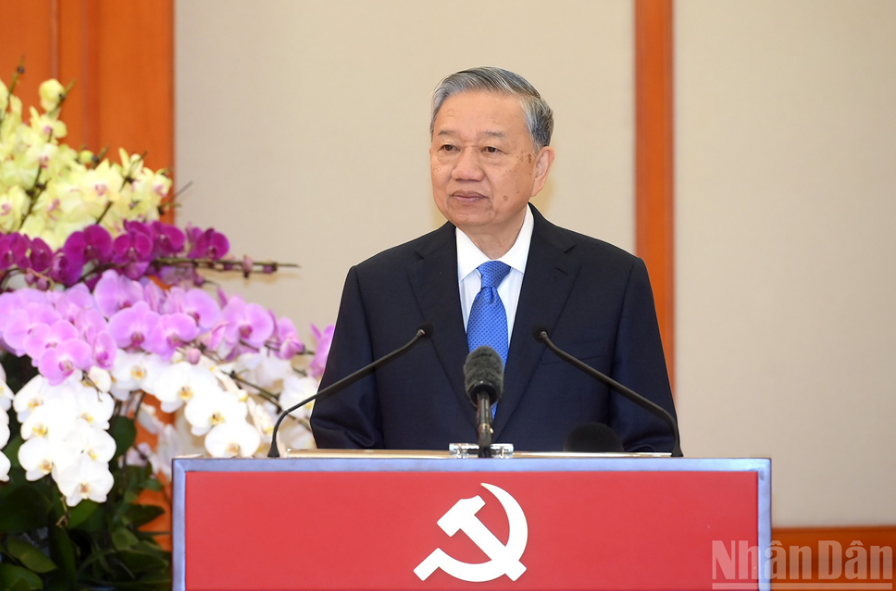 Tổng Bí thư Tô Lâm và các đồng chí lãnh đạo Đảng, Nhà nước và các đại biểu dự hội nghị (Nguồn ảnh: Báo Nhân dân điện tử)